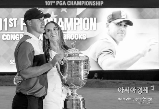 Brooks Koepka takes a commemorative photo with his girlfriend Jenna Sims just after winning last year’s PGA Championship.