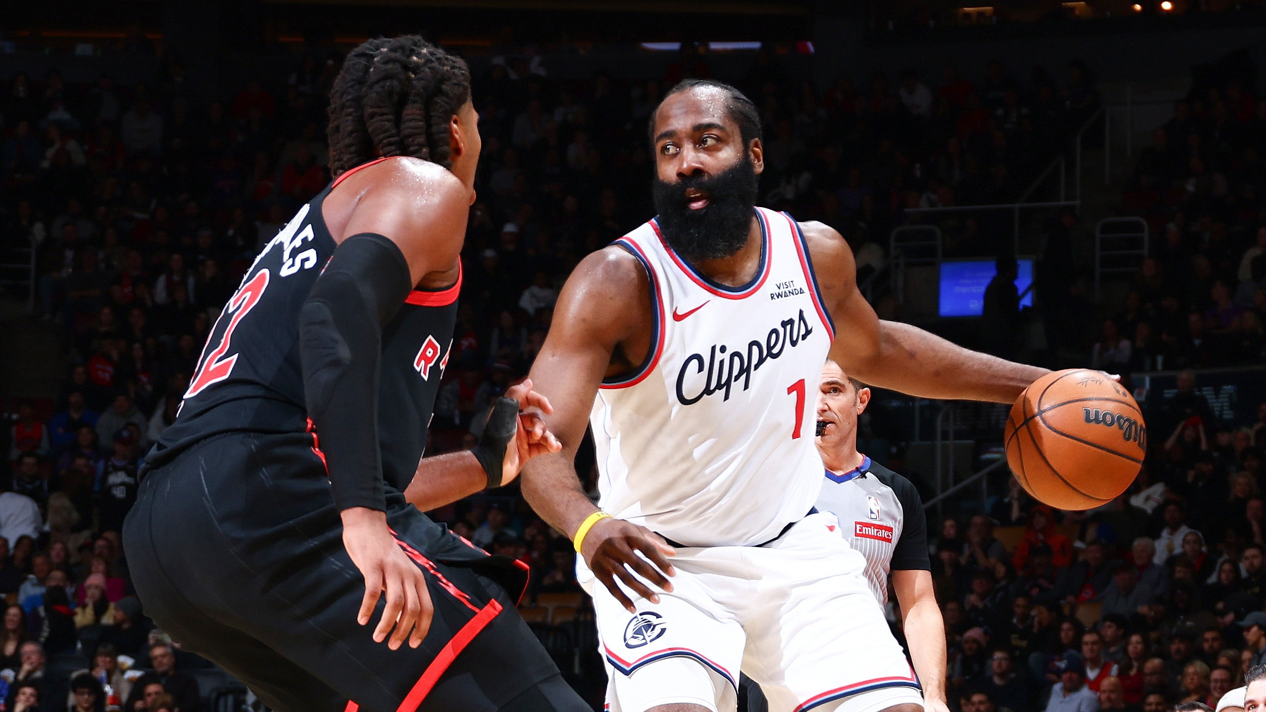 TORONTO, CANADA – JANUARY 16: James Harden #1 of the LA Clippers looks to pass the ball during the game against the Toronto Raptors on January 16, 2026 at Scotiabank Arena in Toronto.